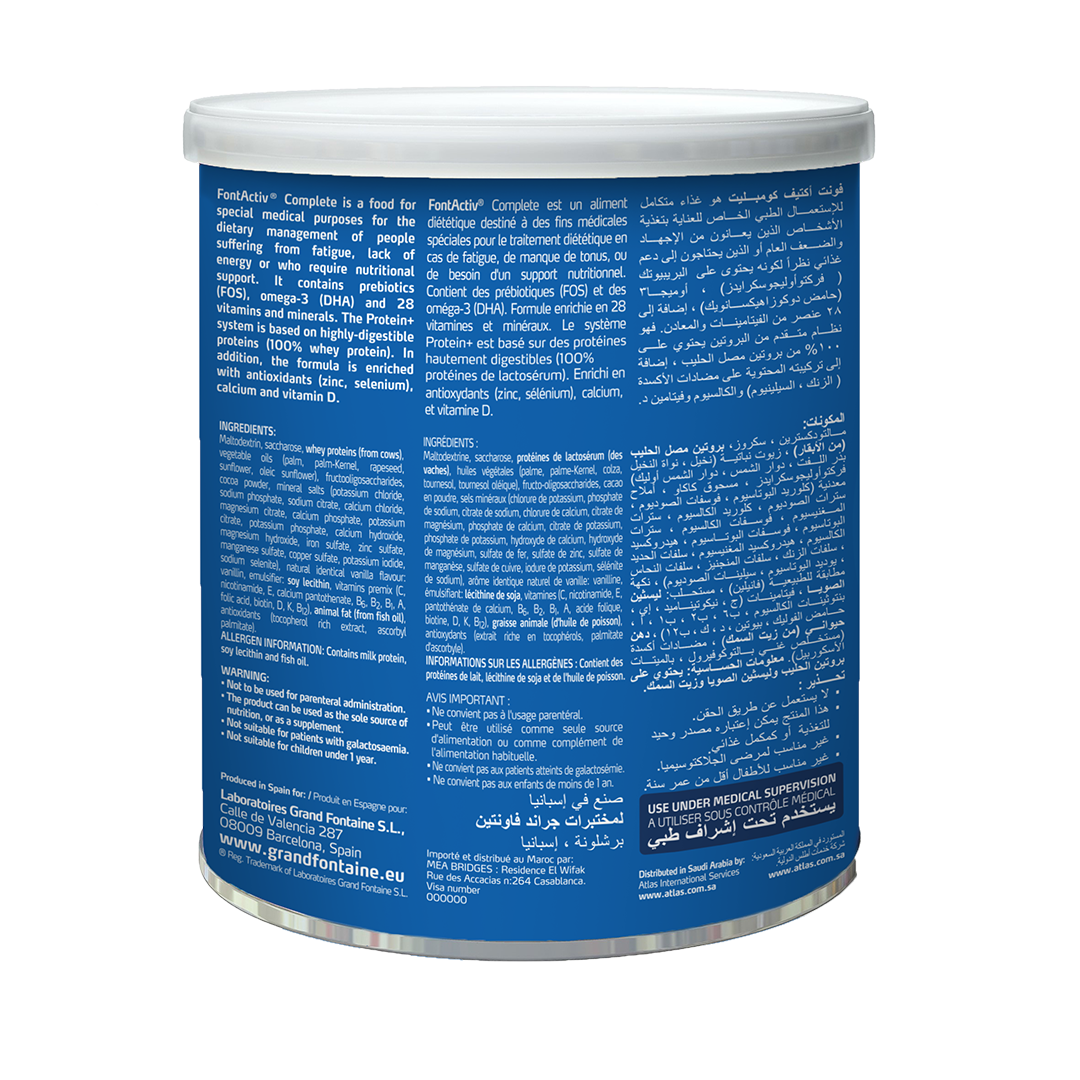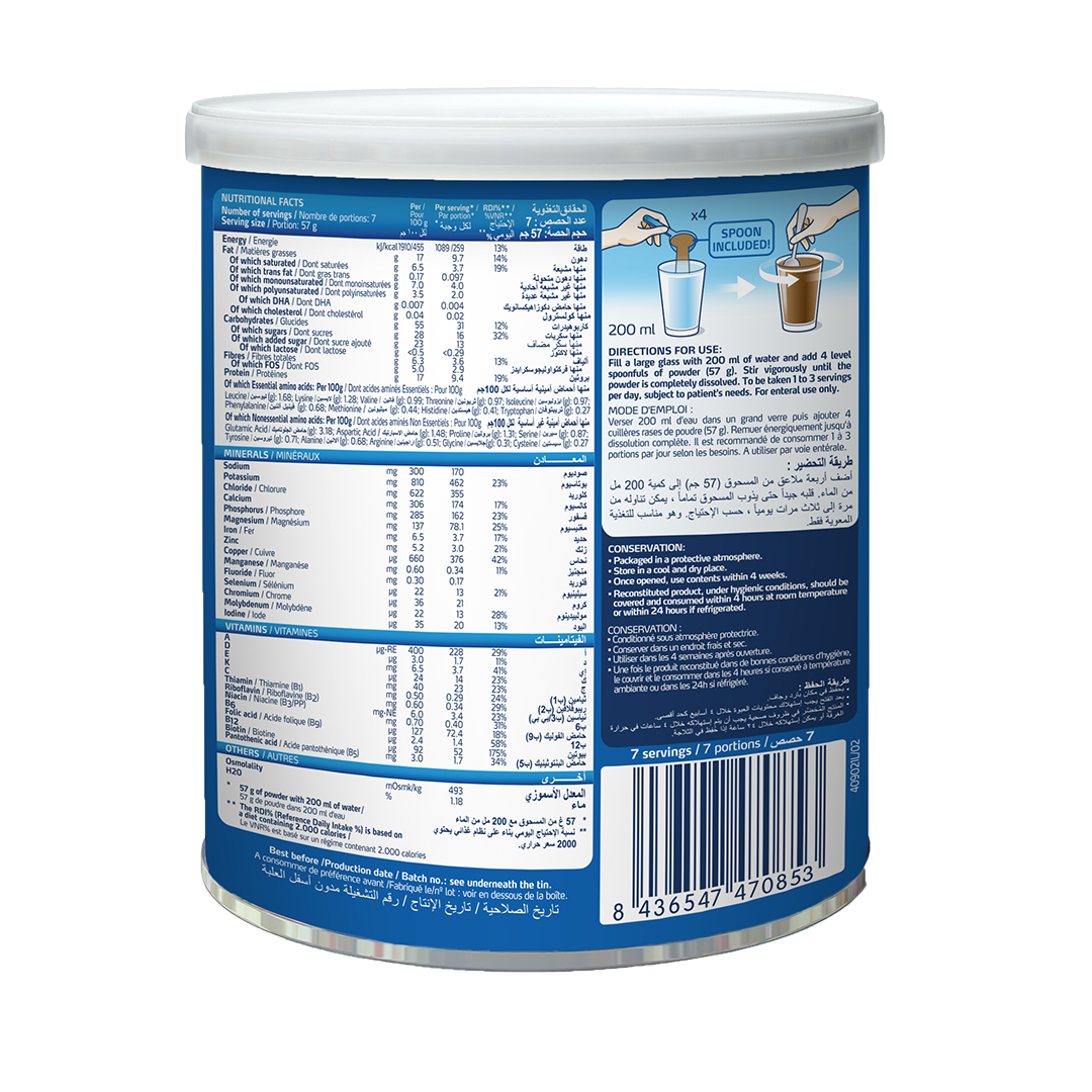 Склад: вода, мальтодекстрин, сахароза, молочні білки, ріпакова олія, порошок какао, порошковий шоколад (молочний), крохмаль модифікований, емульгатори: моно та дигліцериди жирних кислот, стабілізатори: гуарова камедь, каррагінани, мінерали (натрію цитрат, магнію хлорид, калію цитрат, натрію хлорид, калію хлорид, заліза пірофосфат, цинку сульфат, натрію селеніт, марганцю сульфат, міді сульфат, натрію фторид, натрію молібдат, калію йодид, хрому хлорид), коректор кислотності: калію гідроксид, вітаміни (аскорбінова кислота, пантотенова кислота, вітамін В2, вітамін B6, вітамін B1, вітамін A, вітамін K1, фолієва кислота, біотин, вітамін D, вітамін E, ніацин, вітамін B12).